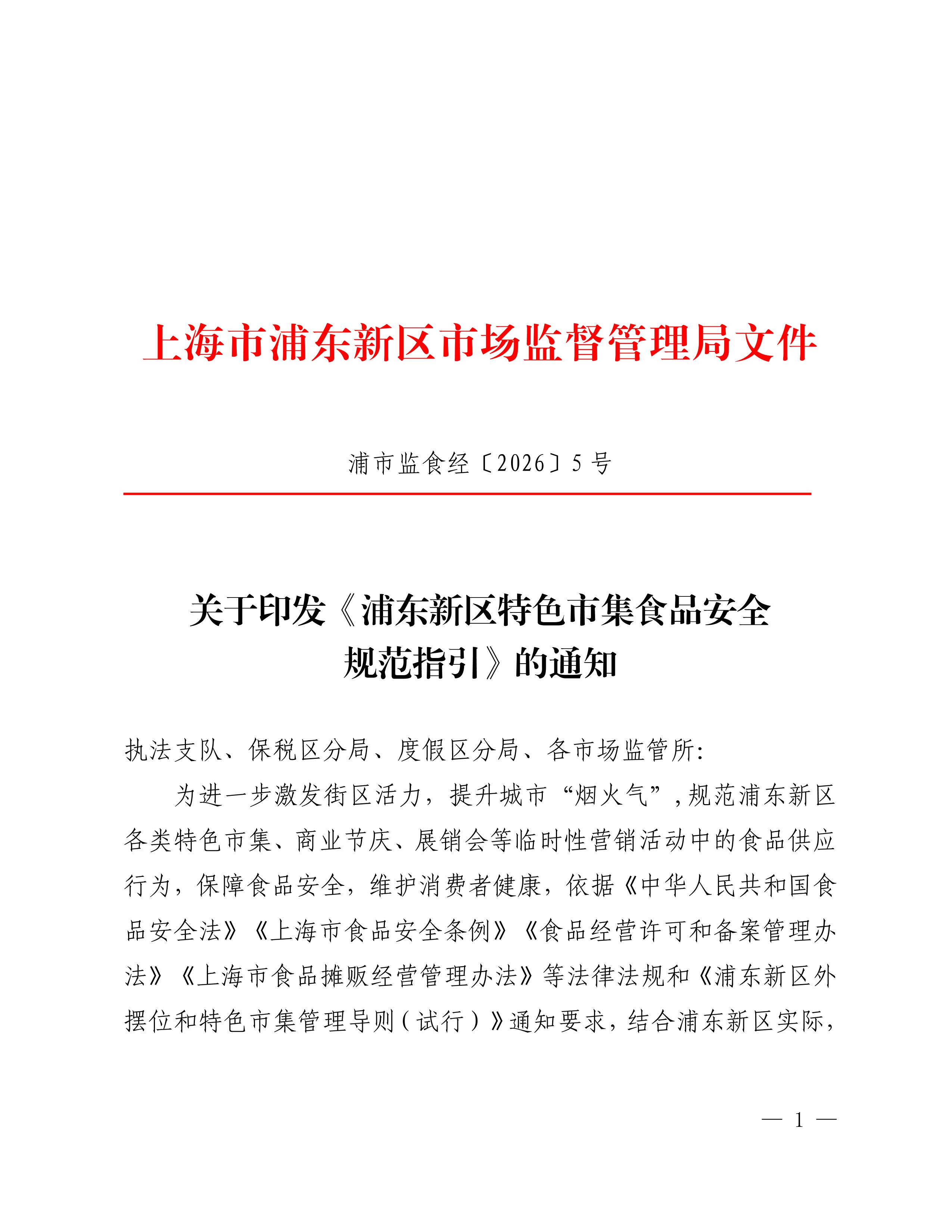 關(guān)于印發(fā)《浦東新區(qū)特色市集食品安全規(guī)范指引》的通知