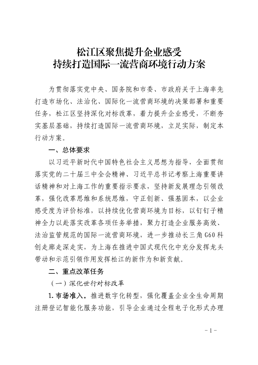 ??為貫徹落實黨中央、國務(wù)院和市委、市政府關(guān)于上海率先打造市場化、法治化、國際化一流營商環(huán)境的決策部署和重要任務(wù),松江區(qū)堅持深化對標改革,著力提升企業(yè)感受,不斷夯實基層基礎(chǔ),持續(xù)打造國際一流營商環(huán)境,立足實際,制定本行動方案。