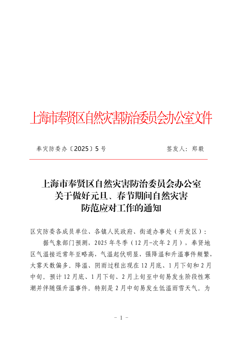 ??據(jù)氣象部門(mén)預(yù)測(cè),2025年冬季(12月-次年2月),奉賢地區(qū)氣溫接近常年至略高,氣溫起伏明顯,強(qiáng)降溫和升溫事件頻繁,大霧天數(shù)偏多。降溫、陰雨過(guò)程出現(xiàn)在12月底、1月下旬和2月中旬。預(yù)計(jì)12月底、1月下旬、2月上旬至中旬易發(fā)生階段性寒潮并伴隨強(qiáng)升溫事件。特別是2月中旬易發(fā)生低溫雨雪天氣。為更好地做好元旦、春節(jié)期間自然災(zāi)害防范應(yīng)對(duì)工作,現(xiàn)就有關(guān)工作通知如下: