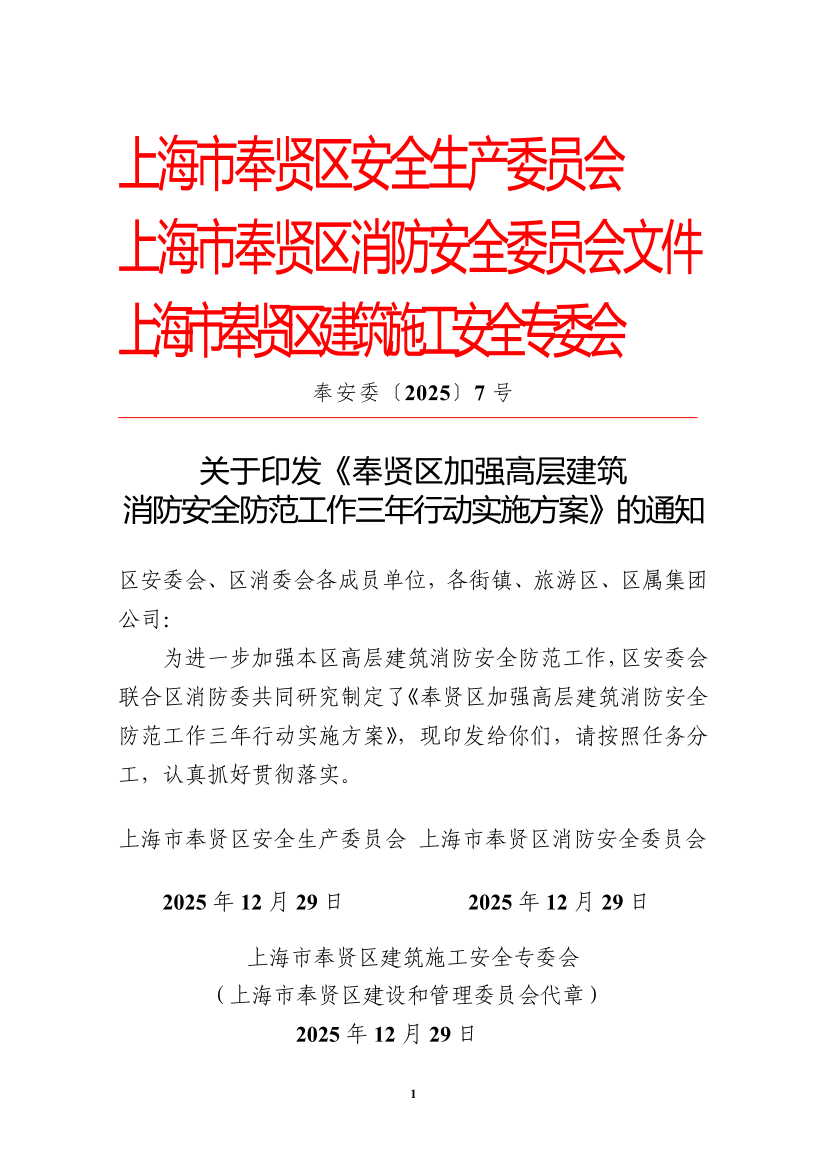??為認(rèn)真貫徹習(xí)近平總書記關(guān)于香港大埔宏福苑火災(zāi)事故重要指示精神,落實(shí)國(guó)務(wù)院安委會(huì)《高層建筑重大火災(zāi)風(fēng)險(xiǎn)隱患排查整治行動(dòng)方案》和上海市安委會(huì)《上海市加強(qiáng)高層建筑消防安全防范工作三年行動(dòng)實(shí)施方案》,進(jìn)一步加強(qiáng)奉賢區(qū)高層建筑消防安全工作,即日起至2028年12月,在全區(qū)范圍集中開展高層建筑消防安全防范工作三年行動(dòng)?,F(xiàn)制定本方案如下。