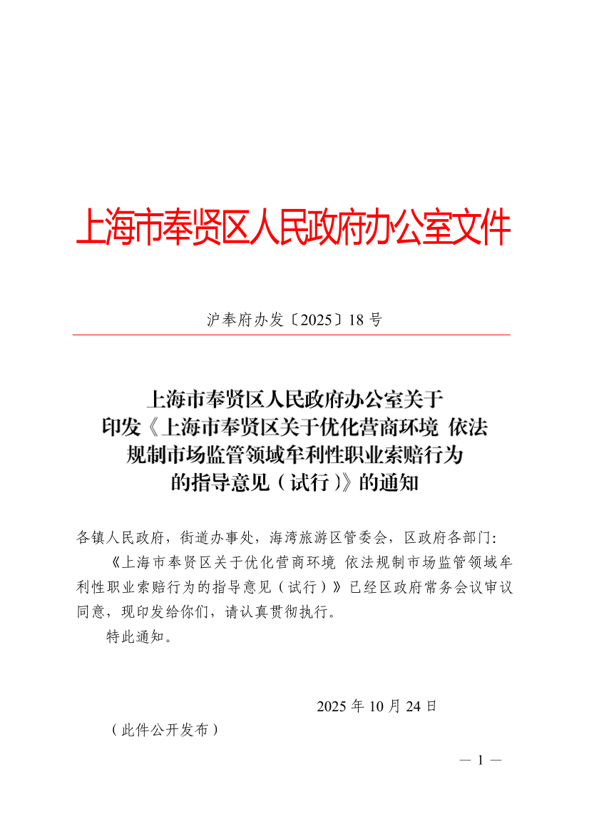 上海市奉賢區(qū)關(guān)于優(yōu)化營(yíng)商環(huán)境依法規(guī)制市場(chǎng)監(jiān)管領(lǐng)域牟利性職業(yè)索賠行為的指導(dǎo)意見(試行)