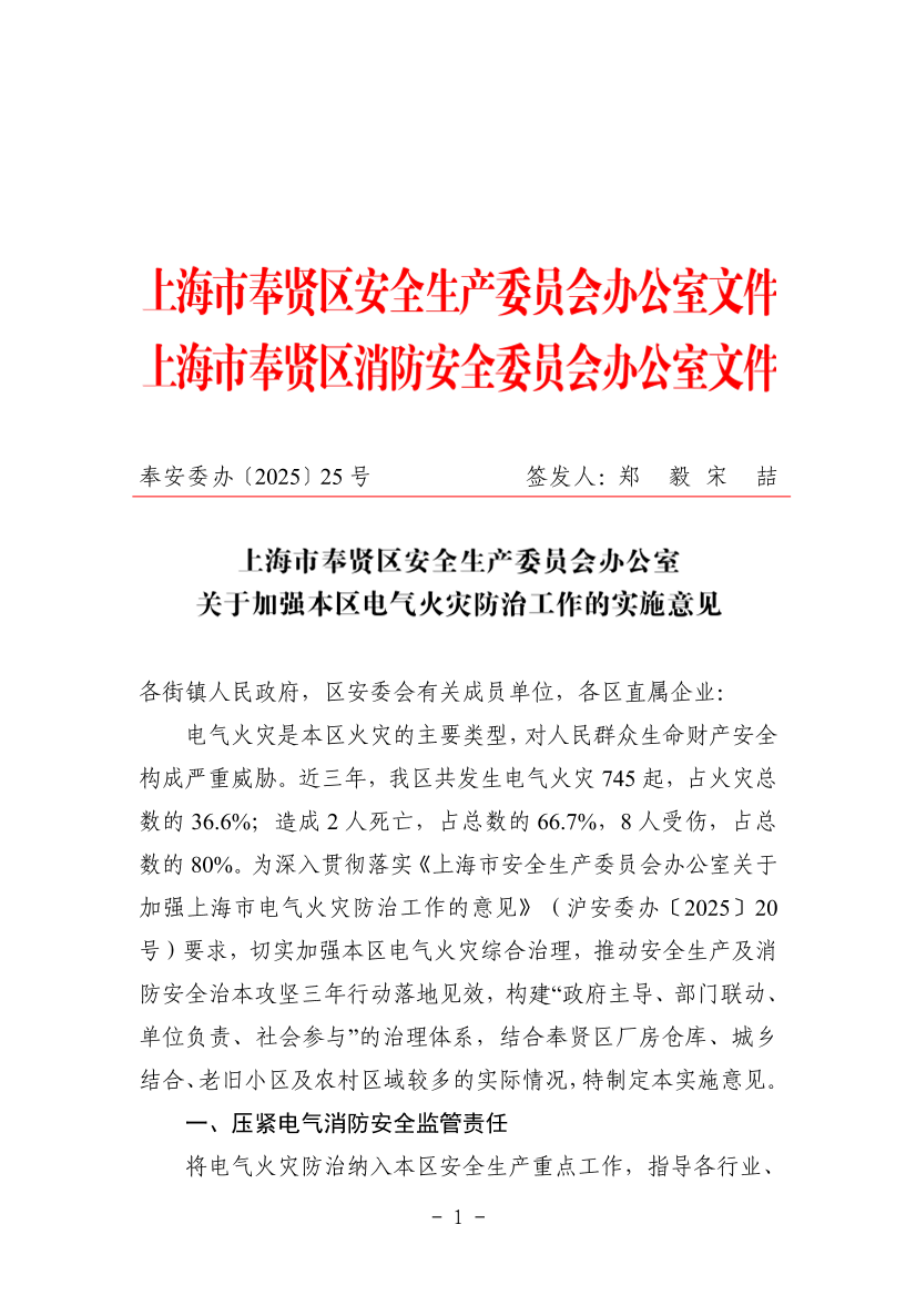 ??電氣火災(zāi)是本區(qū)火災(zāi)的主要類型,對(duì)人民群眾生命財(cái)產(chǎn)安全構(gòu)成嚴(yán)重威脅。近三年,我區(qū)共發(fā)生電氣火災(zāi)745起,占火災(zāi)總數(shù)的36.6%;造成2人死亡,占總數(shù)的66.7%,8人受傷,占總數(shù)的80%。為深入貫徹落實(shí)《上海市安全生產(chǎn)委員會(huì)辦公室關(guān)于加強(qiáng)上海市電氣火災(zāi)防治工作的意見》(滬安委辦〔2025〕20號(hào))要求,切實(shí)加強(qiáng)本區(qū)電氣火災(zāi)綜合治理,推動(dòng)安全生產(chǎn)及消防安全治本攻堅(jiān)三年行動(dòng)落地見效,構(gòu)建“政府主導(dǎo)、部門聯(lián)動(dòng)、單位負(fù)責(zé)、社會(huì)參與”的治理體系,結(jié)合奉賢區(qū)廠房倉(cāng)庫(kù)、城鄉(xiāng)結(jié)合、老舊小區(qū)及農(nóng)村區(qū)域較多的實(shí)際情況,特制定本實(shí)施意見。