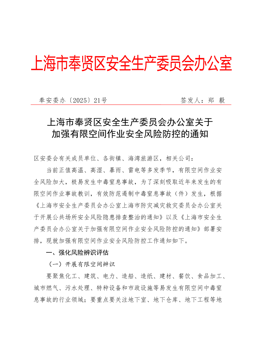 ??當前正值高溫、高濕、暴雨、雷電等多發(fā)季節(jié),有限空間作業(yè)安全風險加大,極易發(fā)生中毒窒息事故,為了深刻吸取近年來發(fā)生的有限空間作業(yè)事故教訓,有效防范遏制中毒窒息事故(件)發(fā)生,根據(jù)《上海市安全生產(chǎn)委員會辦公室上海市防災減災救災委員會辦公室關于開展公共場所安全風險隱患排查整治的通知》以及《上海市安全生產(chǎn)委員會辦公室關于加強有限空間作業(yè)安全風險防控的通知》部署安排,現(xiàn)就加強有限空間作業(yè)安全風險防控工作通知如下。