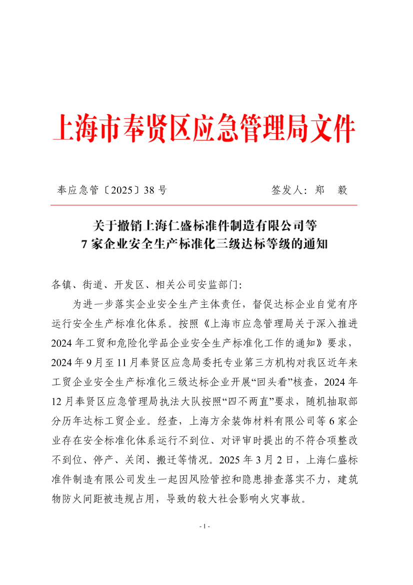 ??為進一步落實企業(yè)安全生產(chǎn)主體責(zé)任,督促達標(biāo)企業(yè)自覺有序運行安全生產(chǎn)標(biāo)準(zhǔn)化體系。按照《上海市應(yīng)急管理局關(guān)于深入推進2024年工貿(mào)和危險化學(xué)品企業(yè)安全生產(chǎn)標(biāo)準(zhǔn)化工作的通知》要求,2024年9月至11月奉賢區(qū)應(yīng)急局委托專業(yè)第三方機構(gòu)對我區(qū)近年來工貿(mào)企業(yè)安全生產(chǎn)標(biāo)準(zhǔn)化三級達標(biāo)企業(yè)開展“回頭看”核查,2024年12月奉賢區(qū)應(yīng)急管理局執(zhí)法大隊按照“四不兩直”要求,隨機抽取部分歷年達標(biāo)工貿(mào)企業(yè)。經(jīng)查,上海方余裝飾材料有限公司等6家企業(yè)存在安全標(biāo)準(zhǔn)化體系運行不到位、對評審時提出的不符合項整改不到位、停產(chǎn)、關(guān)閉、搬遷等情況。2025年3月2日,上海仁盛標(biāo)準(zhǔn)件制造有限公司發(fā)生一起因風(fēng)險管控和隱患排查落實不力,建筑物防火間距被違規(guī)占用,導(dǎo)致的較大社會影響火災(zāi)事故。