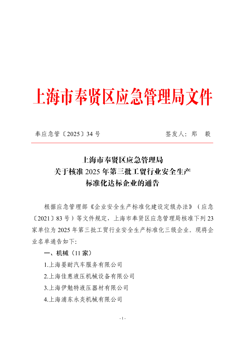 根據(jù)應(yīng)急管理部《企業(yè)安全生產(chǎn)標(biāo)準(zhǔn)化建設(shè)定級辦法》(應(yīng)急〔2021〕83號)等文件規(guī)定,上海市奉賢區(qū)應(yīng)急管理局核準(zhǔn)下列23家單位為2025年第三批工貿(mào)行業(yè)安全生產(chǎn)標(biāo)準(zhǔn)化三級企業(yè)。現(xiàn)將企業(yè)名單通告如下: