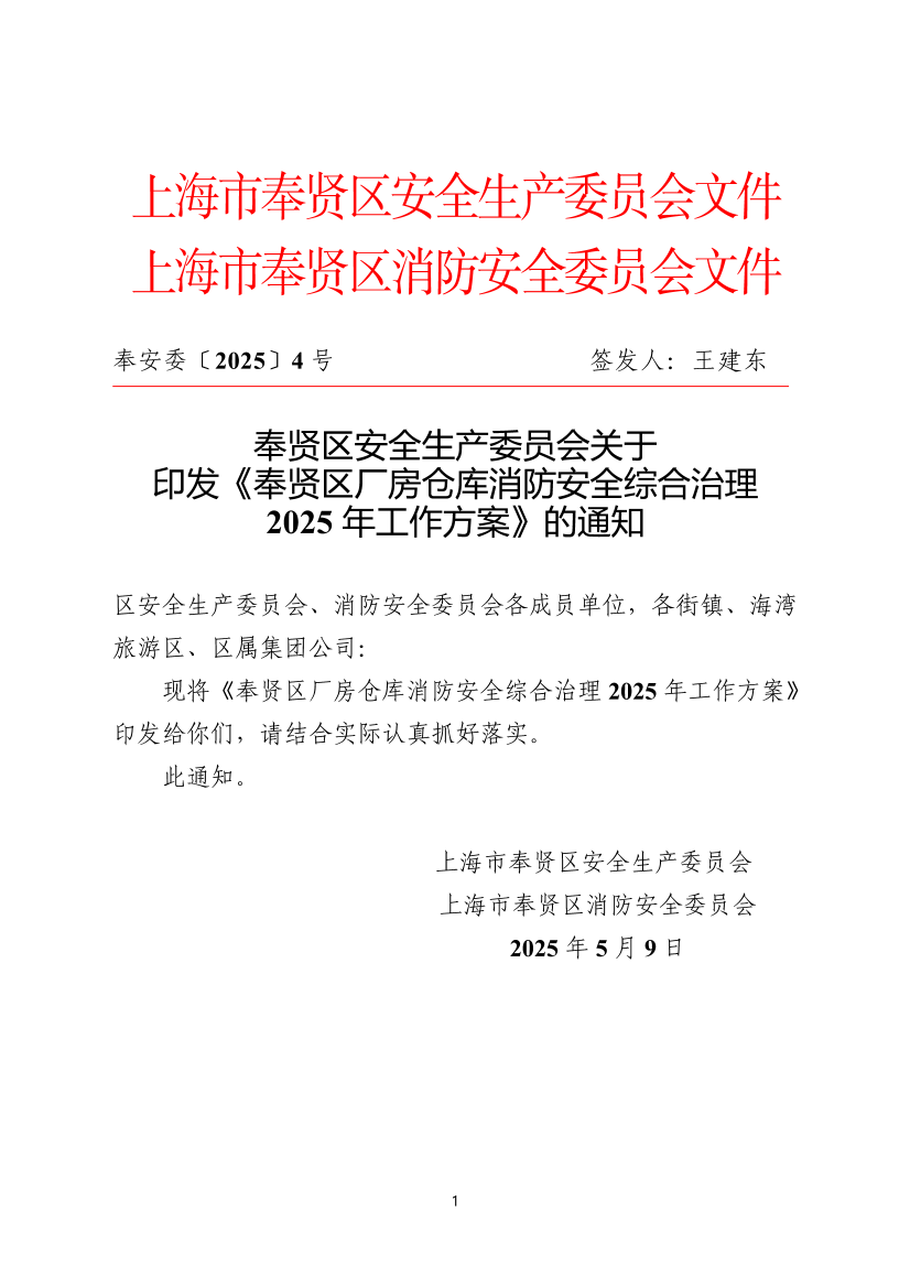 ??現(xiàn)將《奉賢區(qū)廠房倉庫消防安全綜合治理2025年工作方案》印發(fā)給你們,請結(jié)合實(shí)際認(rèn)真抓好落實(shí)。
