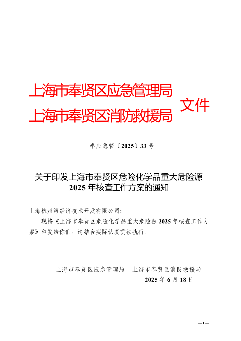 ??現(xiàn)將《上海市奉賢區(qū)危險化學(xué)品重大危險源2025年核查工作方案》印發(fā)給你們,請結(jié)合實際認(rèn)真貫徹執(zhí)行。