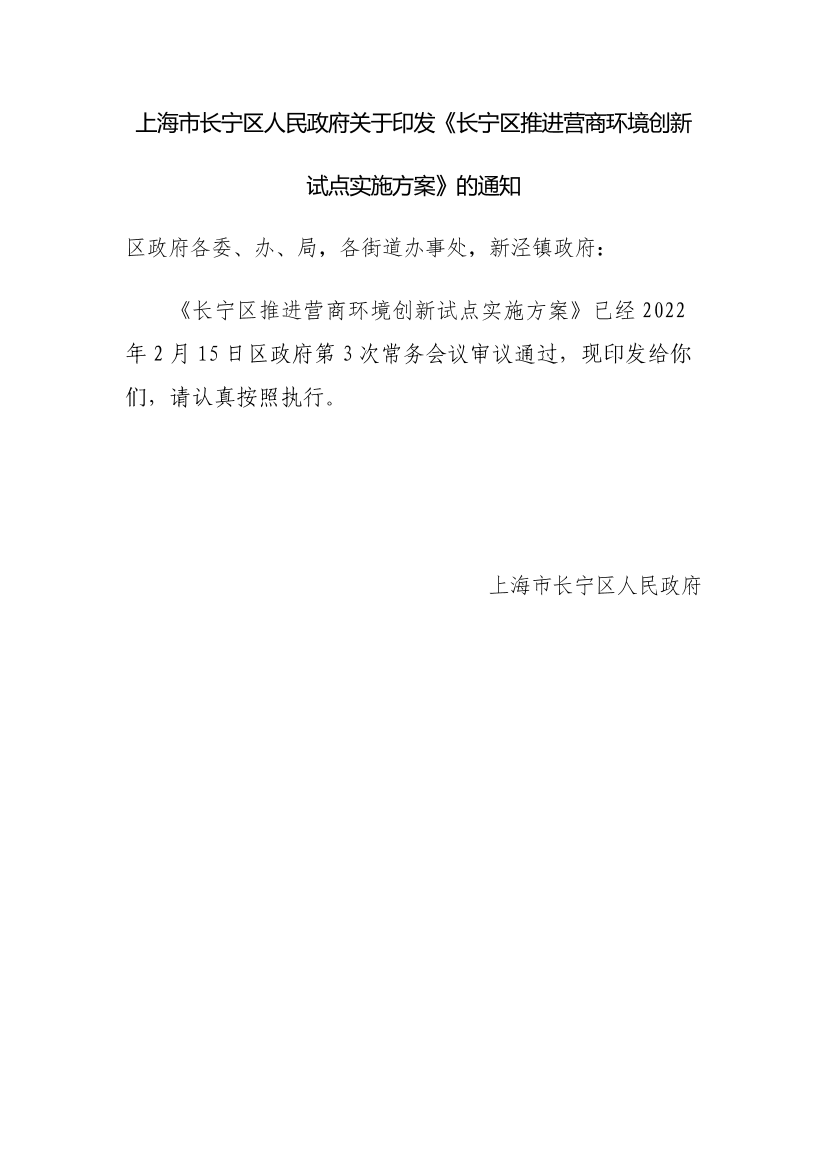 ??《長寧區(qū)推進(jìn)營商環(huán)境創(chuàng)新試點實施方案》已經(jīng)2022年2月15日區(qū)政府第3次常務(wù)會議審議通過,現(xiàn)印發(fā)給你們,請認(rèn)真按照執(zhí)行。