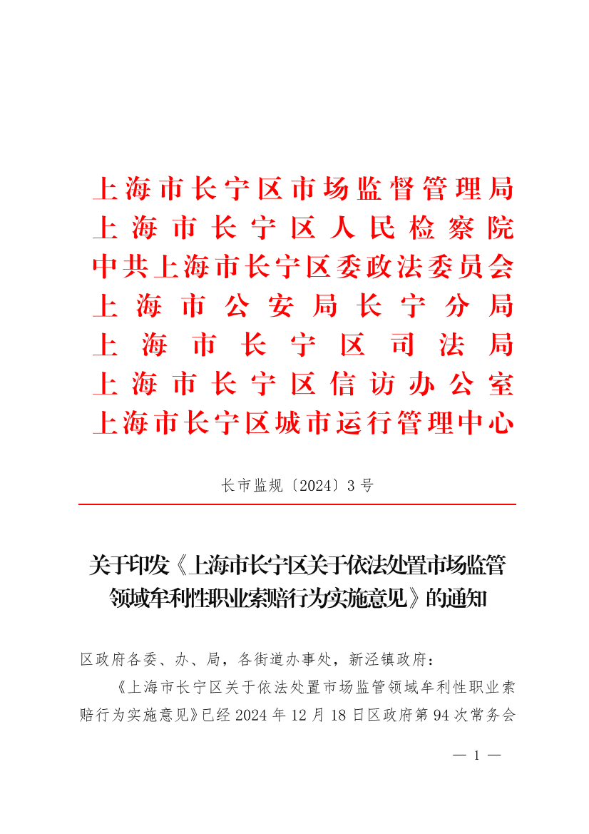 ??《上海市長寧區(qū)關(guān)于依法處置市場監(jiān)管領(lǐng)域牟利性職業(yè)索賠行為實施意見》已經(jīng)2024年12月18日區(qū)政府第94次常務(wù)會議審議通過,現(xiàn)予印發(fā)。