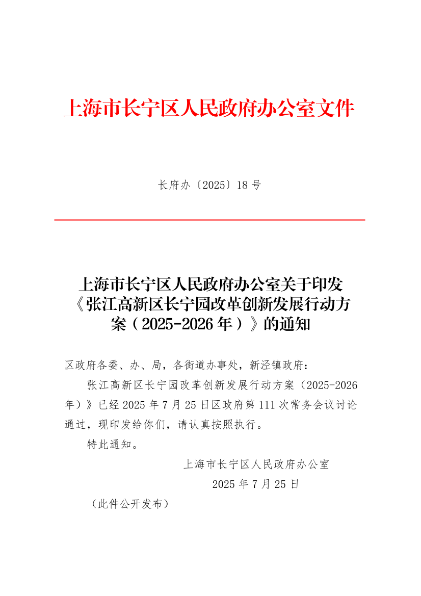 ??張江高新區(qū)長寧園改革創(chuàng)新發(fā)展行動方案(2025-2026年)》已經(jīng)2025年7月25日區(qū)政府第111次常務(wù)會議討論通過,現(xiàn)印發(fā)給你們,請認(rèn)真按照執(zhí)行。