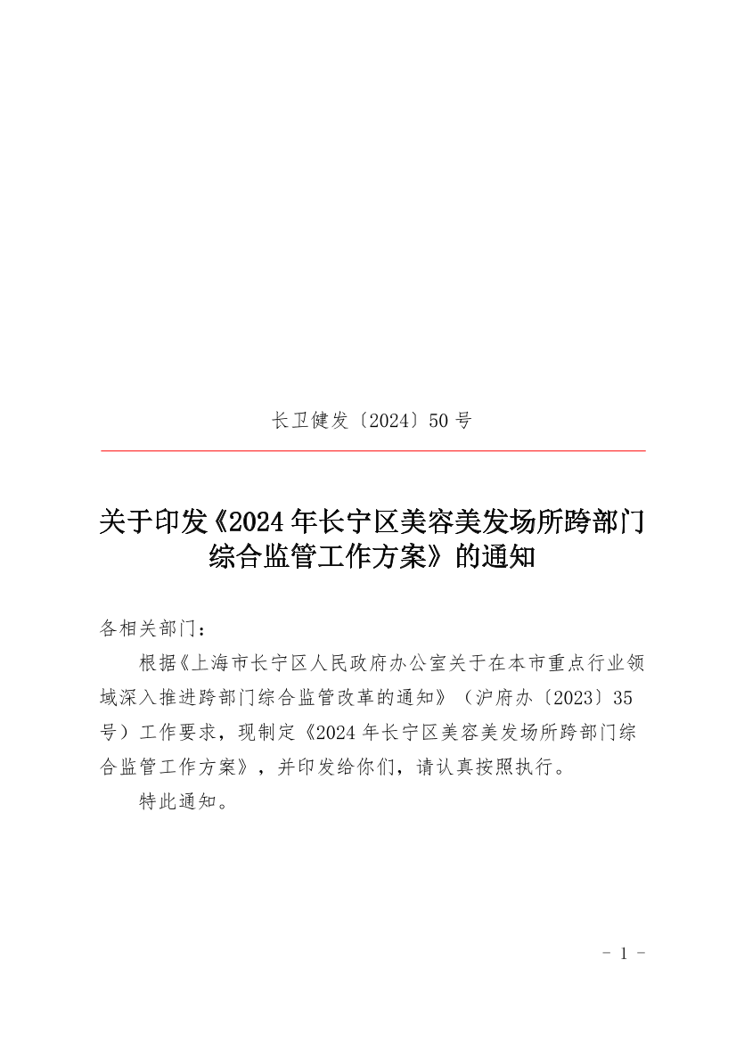 ??根據(jù)《上海市長寧區(qū)人民政府辦公室關(guān)于在本市重點行業(yè)領(lǐng)域深入推進跨部門綜合監(jiān)管改革的通知》(滬府辦〔2023〕35號)工作要求,現(xiàn)制定《2024年長寧區(qū)美容美發(fā)場所跨部門綜合監(jiān)管工作方案》,并印發(fā)給你們,請認真按照執(zhí)行。