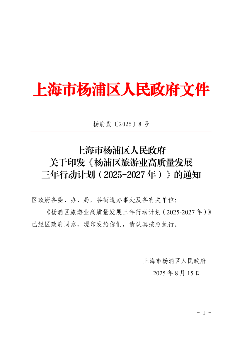 ??《楊浦區(qū)旅游業(yè)高質(zhì)量發(fā)展三年行動計(jì)劃(2025-2027年)》已經(jīng)區(qū)政府同意,現(xiàn)印發(fā)給你們,請認(rèn)真按照執(zhí)行。