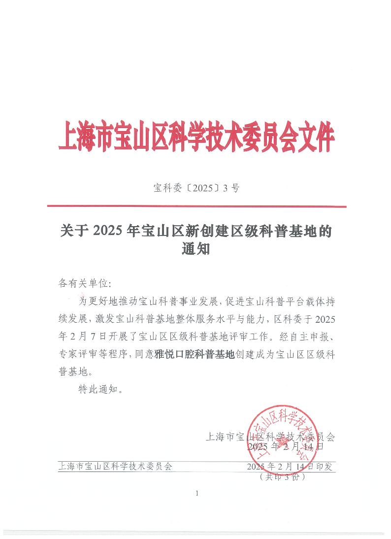 ??為更好地推動寶山科普事業(yè)發(fā)展,促進寶山科普平臺載體持續(xù)發(fā)展,激發(fā)寶山科普基地整體服務水平與能力,區(qū)科委于2025年2月7日開展了寶山區(qū)區(qū)級科普基地評審工作。經(jīng)自主申報、專家評審等程序,同意雅悅口腔科普基地創(chuàng)建成為寶山區(qū)區(qū)級科普基地。