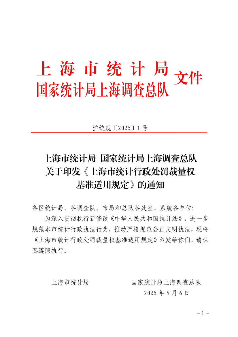??為深入貫徹執(zhí)行新修改《中華人民共和國統(tǒng)計法》,進一步規(guī)范本市統(tǒng)計行政執(zhí)法行為,推動嚴格規(guī)范公正文明執(zhí)法,現(xiàn)將《上海市統(tǒng)計行政處罰裁量權基準適用規(guī)定》印發(fā)給你們,請認真遵照執(zhí)行。