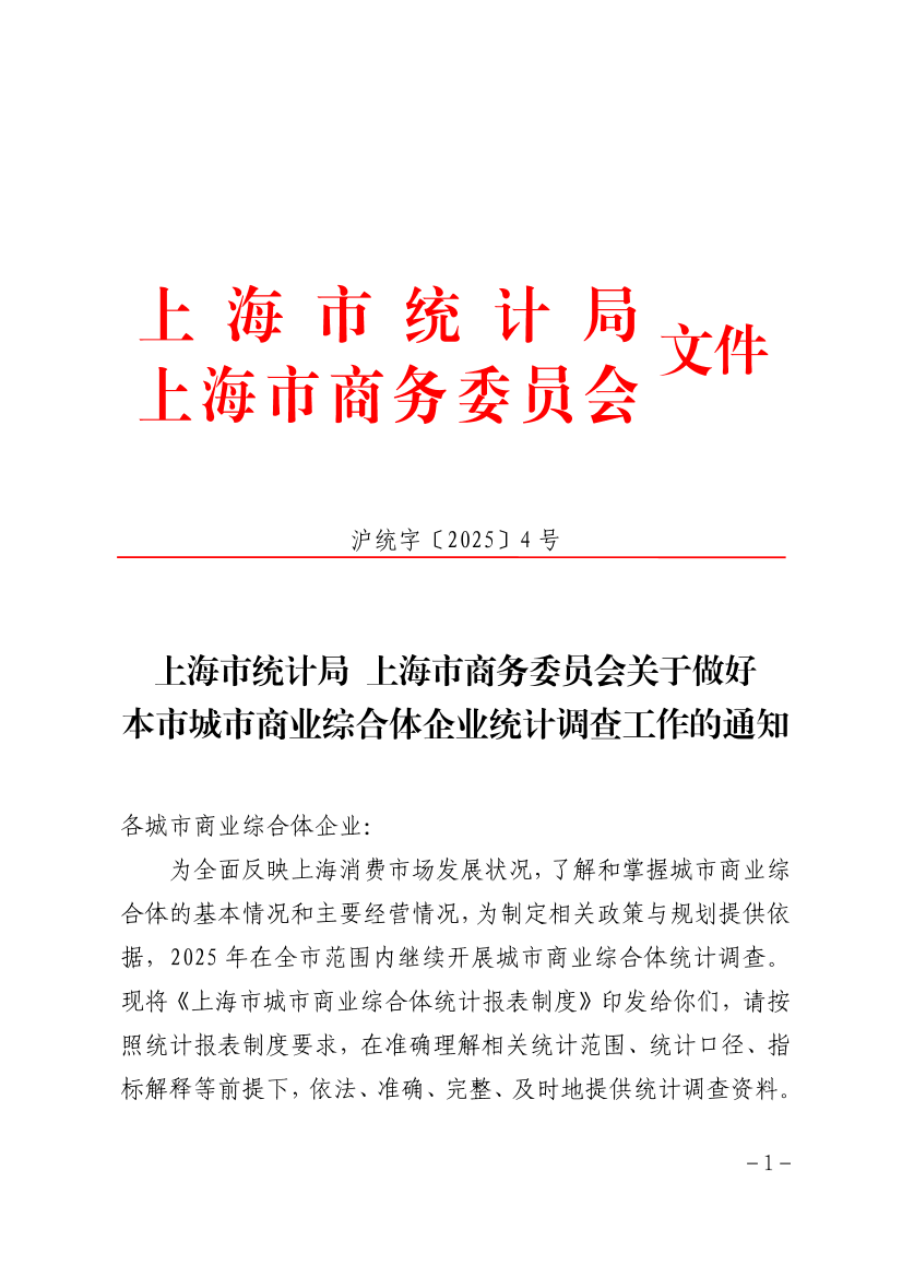??為全面反映上海消費市場發(fā)展狀況,了解和掌握城市商業(yè)綜合體的基本情況和主要經(jīng)營情況,為制定相關(guān)政策與規(guī)劃提供依據(jù),2025年在全市范圍內(nèi)繼續(xù)開展城市商業(yè)綜合體統(tǒng)計調(diào)查。現(xiàn)將《上海市城市商業(yè)綜合體統(tǒng)計報表制度》印發(fā)給你們,請按照統(tǒng)計報表制度要求,在準確理解相關(guān)統(tǒng)計范圍、統(tǒng)計口徑、指標解釋等前提下,依法、準確、完整、及時地提供統(tǒng)計調(diào)查資料。