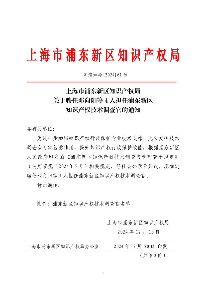 ??為進(jìn)一步加強(qiáng)知識(shí)產(chǎn)權(quán)行政保護(hù)專業(yè)技術(shù)支撐,充分發(fā)揮技術(shù)調(diào)查官專家智囊作用,提升知識(shí)產(chǎn)權(quán)行政保護(hù)效能,根據(jù)浦東新區(qū)人民政府印發(fā)的《浦東新區(qū)知識(shí)產(chǎn)權(quán)技術(shù)調(diào)查官管理若干規(guī)定》(浦府管規(guī)〔2024〕5號(hào))相關(guān)規(guī)定,經(jīng)社會(huì)公示無異議,現(xiàn)確定聘任鄧向陽(yáng)等4人擔(dān)任浦東新區(qū)知識(shí)產(chǎn)權(quán)技術(shù)調(diào)查官。