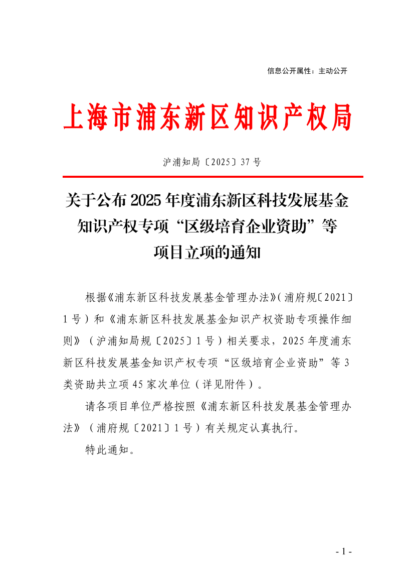 ??根據(jù)《浦東新區(qū)科技發(fā)展基金管理辦法》(浦府規(guī)〔2021〕1號)和《浦東新區(qū)科技發(fā)展基金知識產(chǎn)權資助專項操作細則》(滬浦知局規(guī)〔2025〕1號)相關要求,2025年度浦東新區(qū)科技發(fā)展基金知識產(chǎn)權專項“區(qū)級培育企業(yè)資助”等3類資助共立項45家次單位(詳見附件)。