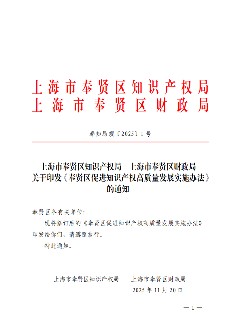奉賢區(qū)促進知識產(chǎn)權(quán)高質(zhì)量發(fā)展實施辦法