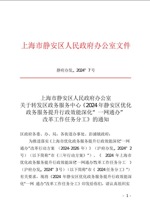 ??為推進(jìn)落實(shí)《上海市優(yōu)化政務(wù)服務(wù)提升行政效能深化“一網(wǎng)通辦”改革行動(dòng)方案(2024-2026年)》(滬府辦發(fā)〔2024〕2號(hào))(以下簡(jiǎn)稱“市《三年行動(dòng)方案》”)、《2024年上海市優(yōu)化政務(wù)服務(wù)提升行政效能深化“一網(wǎng)通辦”改革工作任務(wù)分工》(滬府辦發(fā)〔2024〕3號(hào))(以下簡(jiǎn)稱“市《2024任務(wù)分工》”)有關(guān)要求,現(xiàn)將《2024年靜安區(qū)優(yōu)化政務(wù)服務(wù)提升行政效能深化“一網(wǎng)通辦”改革工作任務(wù)分工》印發(fā)給你們,請(qǐng)認(rèn)真組織實(shí)施。