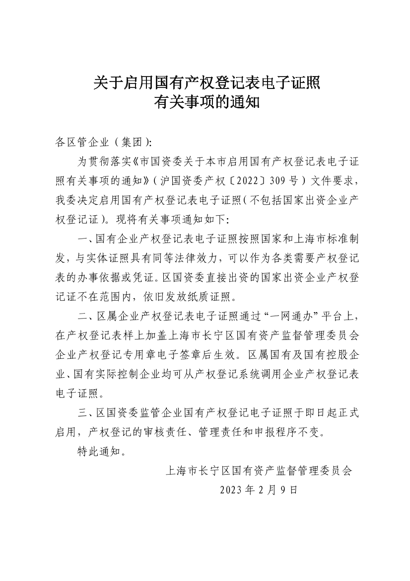 ??為貫徹落實《市國資委關(guān)于本市啟用國有產(chǎn)權(quán)登記表電子證照有關(guān)事項的通知》(滬國資委產(chǎn)權(quán)〔2022〕309號)文件要求,我委決定啟用國有產(chǎn)權(quán)登記表電子證照(不包括國家出資企業(yè)產(chǎn)權(quán)登記證)。現(xiàn)將有關(guān)事項通知如下: