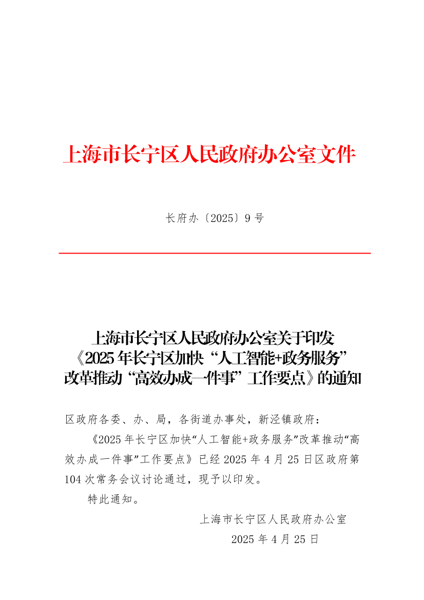 ??《2025年長寧區(qū)加快“人工智能+政務(wù)服務(wù)”改革推動“高效辦成一件事”工作要點》已經(jīng)2025年4月25日區(qū)政府第104次常務(wù)會議討論通過,現(xiàn)予以印發(fā)。