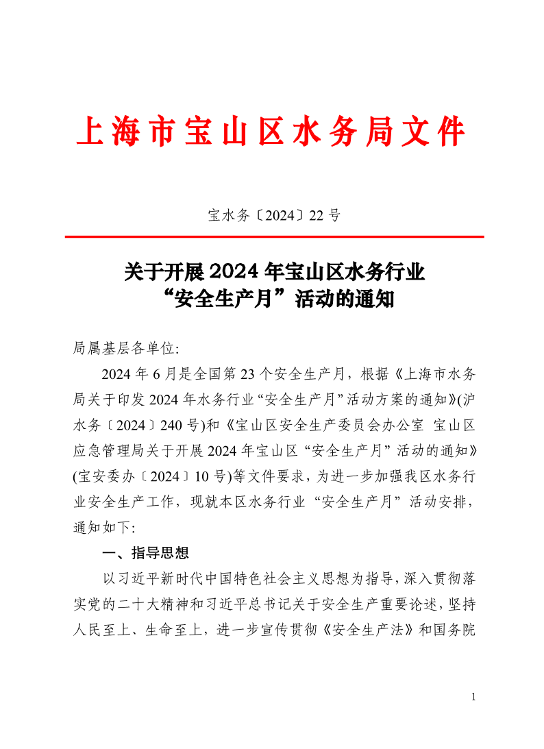 ??2024年6月是全國第23個安全生產(chǎn)月,根據(jù)《上海市水務局關于印發(fā)2024年水務行業(yè)“安全生產(chǎn)月”活動方案的通知》(滬水務﹝2024﹞240號)和《寶山區(qū)安全生產(chǎn)委員會辦公室 寶山區(qū)應急管理局關于開展2024年寶山區(qū)“安全生產(chǎn)月”活動的通知》(寶安委辦﹝2024﹞10號)等文件要求,為進一步加強我區(qū)水務行業(yè)安全生產(chǎn)工作,現(xiàn)就本區(qū)水務行業(yè)“安全生產(chǎn)月”活動安排,通知如下:
